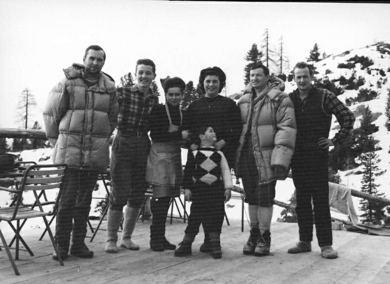 Zima 1964 pod Tofaną. Od lewej J.Kurczab,R.Szafirski,gospodarze schroniska A.Dibona ,J.Krajski i R.Rodziński