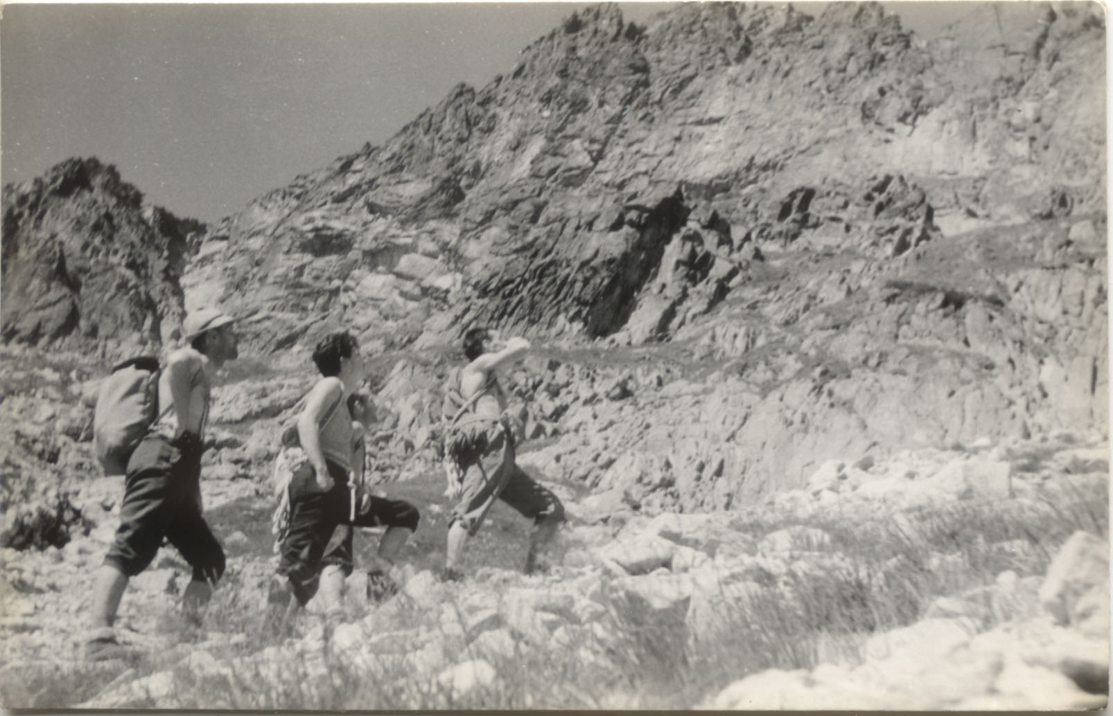 Miejsce akcji: Dolina Jastrzębia. W środku Gienek Chrobak, po lewej ja, po prawej Jerzy Czerczuk ("Mefisto"). Za Chrobakiem widać Andrzeja Paczkowskiego ("Owcę") a fotografuje Rysiek Szafirski. Chrobak z Szafirskim idą na Mały Kołowy Szczyt (Motyka) a reszta na dr. Sadka na Kołowym Szczycie.
