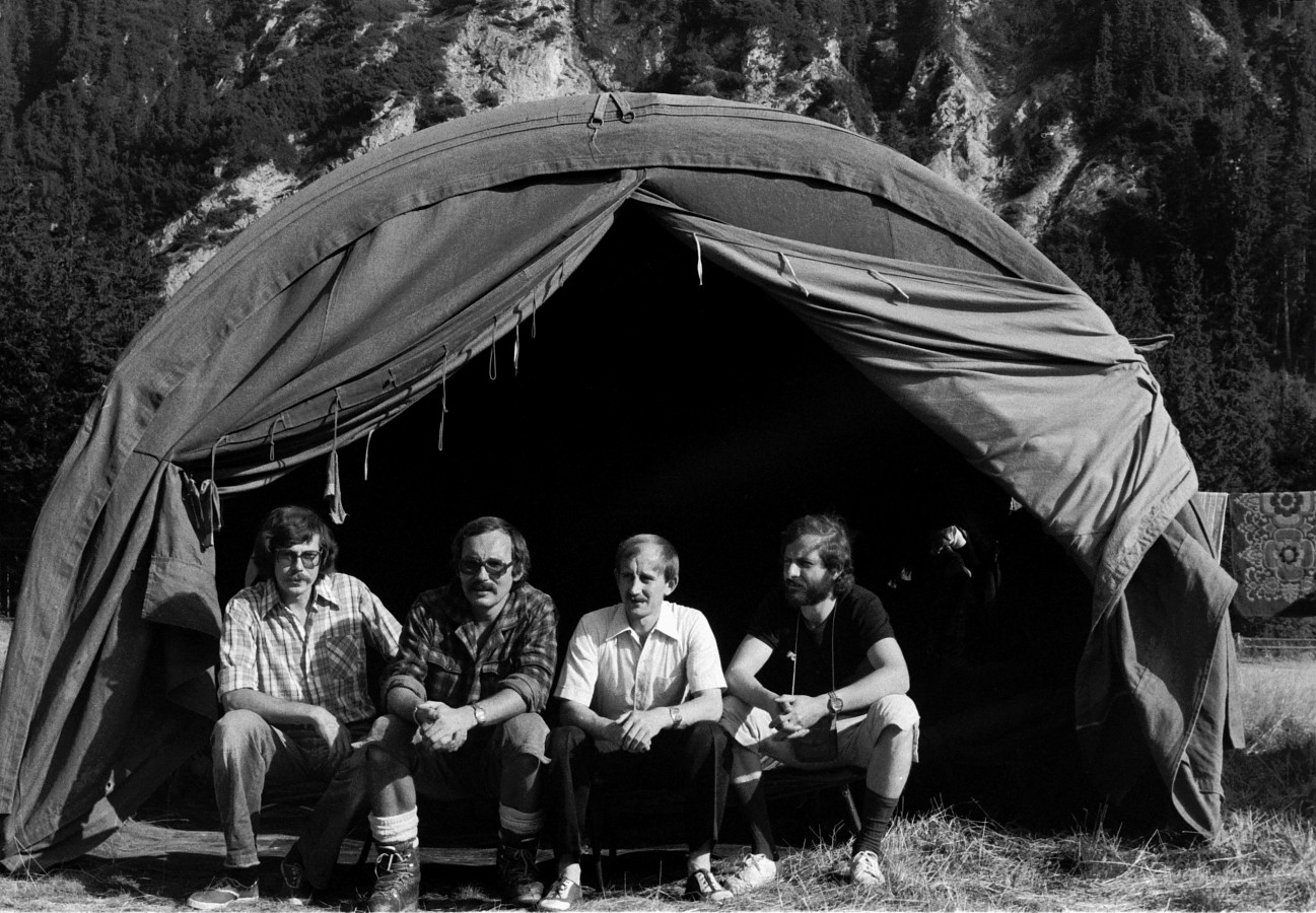 Palenica Białczańska. Grupa „instruktorów” w dniu wyjazdu przed swoim namiotem. Od l. H. Kałużny, J. Kempiński, J. Krajnik i A. Pierzyński.