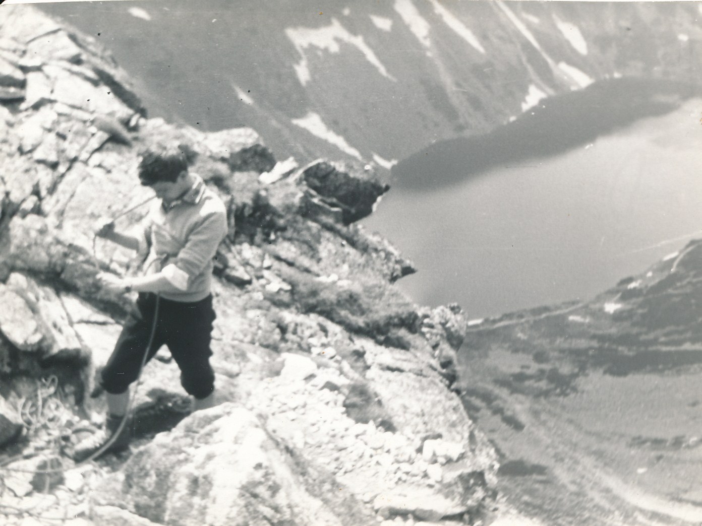 Marek Arslanowicz mial jedna zdrowa zasade - nie wspinal sie, mianowicie, po drogach trudniejszych niz "czworka", co skazywalo go na partnerow mojej klasy i zapewnilo ksywe Dekownik.Tutaj po przejsciu zeberka w Granatach.