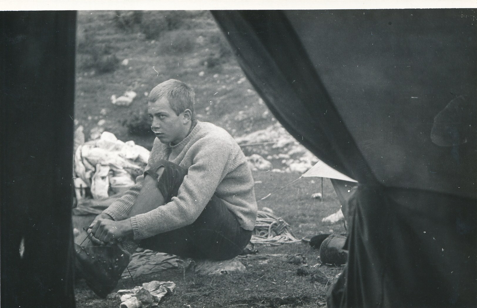 Volujak 1969 "Babel" Janusz Smolski przygotowuje si do wyjscia na wspinaczke.Z Jozkiem mielismy taka umowe - mozemy wspinac ile tylko mamy ochote przy okazji testujac podejrzne otwory skalne.Gdy jednak pozostali znajda jakas duza jaskinie to wtedy wlaczamy sie do akcji pelna para.