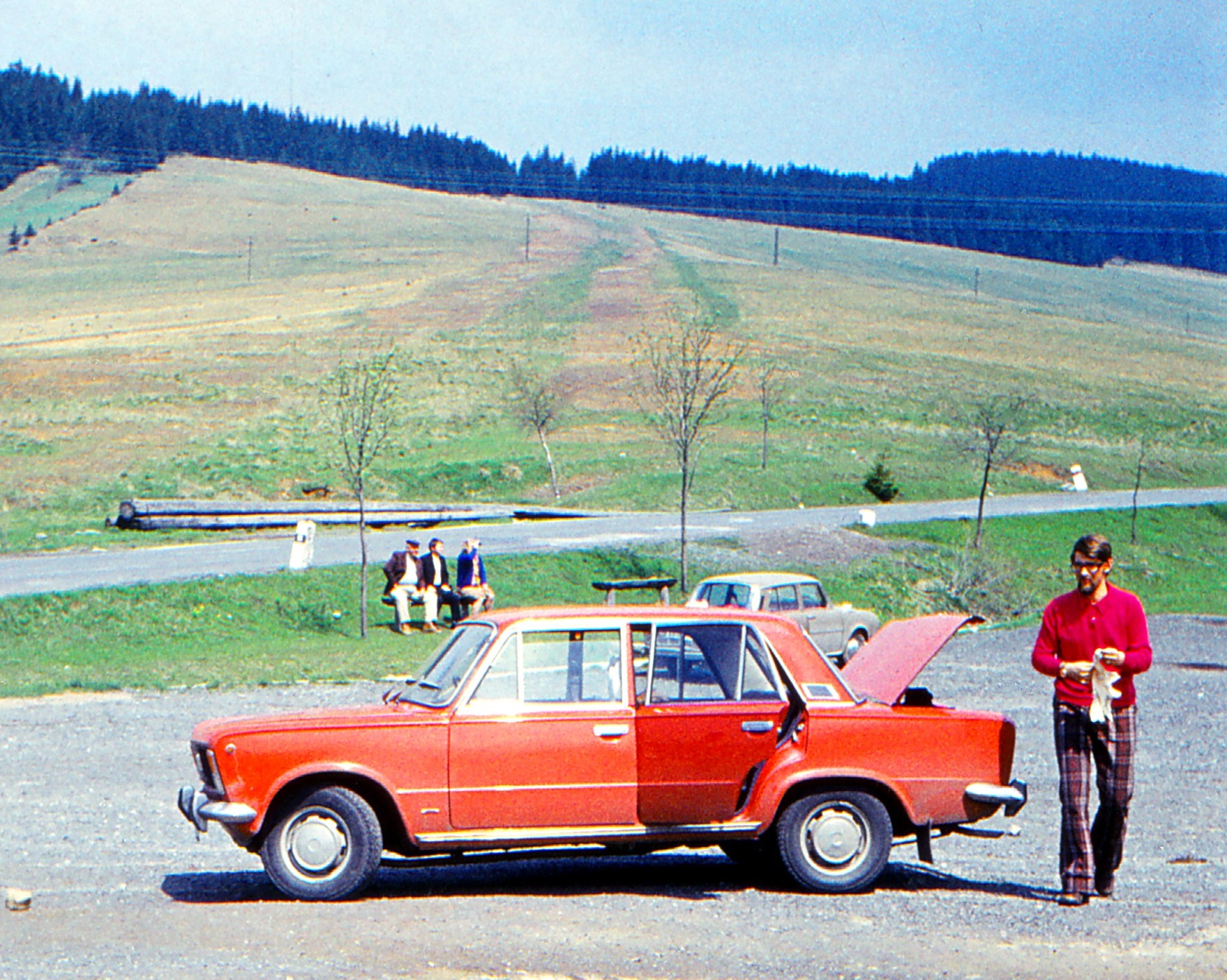 Drugim zelaznym partnerem do tatrzanskich wypadow byl Pawel Gibinski tutaj na tle nowego Fiata podczas wyjazdu na Slowacje.Wczesniej jezdzilismy mydelniczka czyli Pawlowym Trabantem.