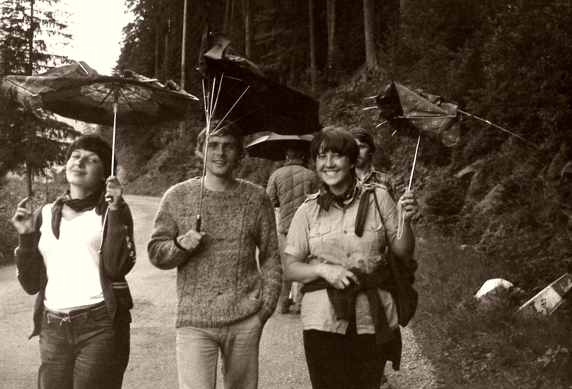 Lato 1980. Od lewej: Ela Czyżewska (siostra Małolata), Maciej Kmiećkowiak i Grażyna Pawłowska na drodze z MOka do Roztoki