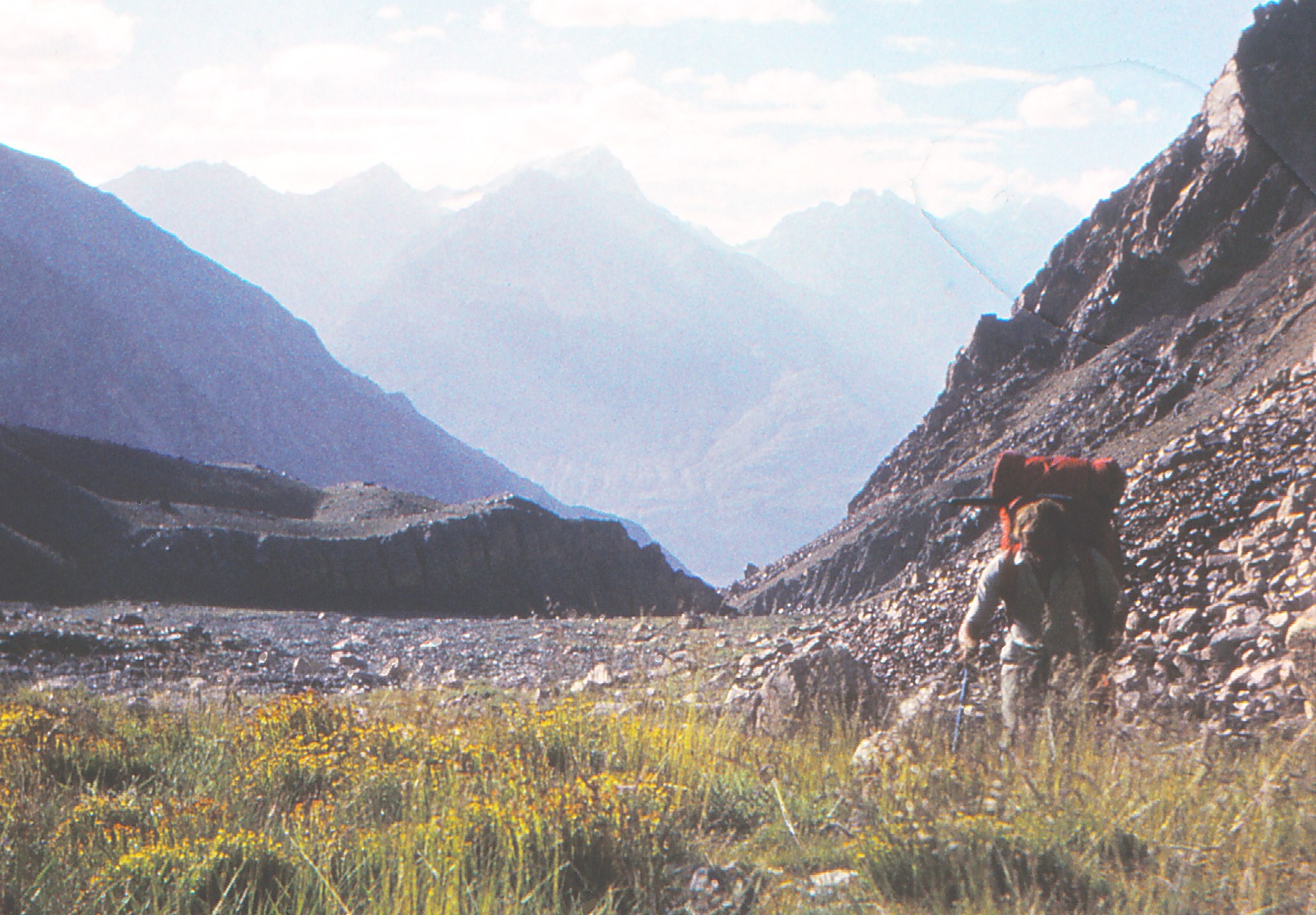 Jasiu Kielkowski dochodzi do ostatniej laczki przed lodowcem.W tle Pamir.