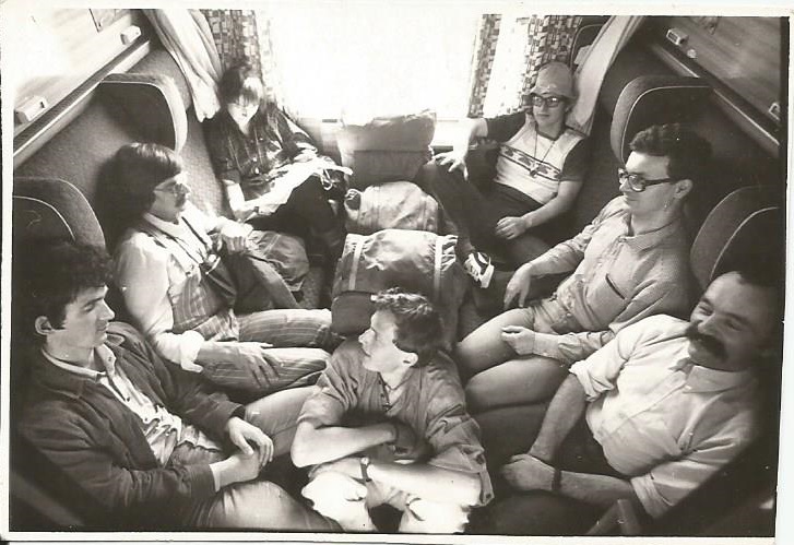 W drodze na obóz KW Częstochowa w Dolomitach 1981. Siedzą od lewej: Marek Serwa, Krzysztof Piechocki, Halina Kaniut, Marek Ścibielski, Andrzej Leśniak, w środku Jacek Włodarczyk