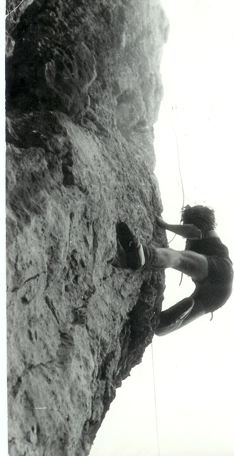Marek Kowalczyk na filarku między Walishami.Zdjęcie z I Zawodów Wspinaczkowych" w dol.Bolechowickiej 1973.